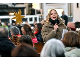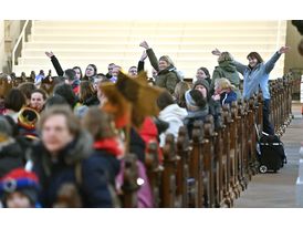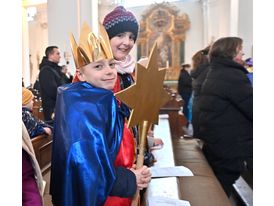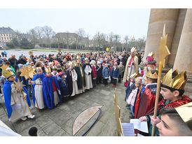 Nach dem Gottesdienst, bei dem Kinder aus Amöneburg-Roßdorf und Schleid die Fürbitten vorgetragen hatten, zogen die Sternsinger gemeinsam mit Bischof Gerber auf den Domplatz. Eine Gruppe schrieb den Segen an das Portal des Domes, so wie in den vergangenen Wochen viele Häuser gesegnet worden waren. Zudem sangen alle „Wir kommen daher aus dem Morgenland“, bevor es quer durch die Stadt zur Fuldaer Marienschule ging, wo Essen, Getränke und Workshopangebote sowie das Sternsingermobil auf alle warteten.